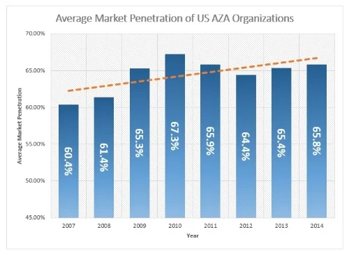 Here, we see that market penetration of AZA organizations has increased by a hair over 5%. Therefore, attendance is growing at a faster rate than overall population growth. The takeaway here is that most areas in the nation are experiencing positive population growth, but zoo attendance is growing at a more rapid rate. High-fives, everyone!