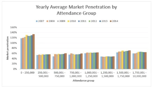 What we see here is that while organizations of all sizes are experiencing growth, those towards the smaller end of the spectrum are achieving larger gains in market penetration. The 2007-2014 total change in penetration by attendance group is as follows: