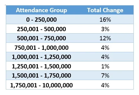 Let’s zoom in. One way we often go about grouping organizations is by looking at them in relation to zoos with similar attendance figures. As it turns out, not all zoos and aquariums are growing at the same rate: