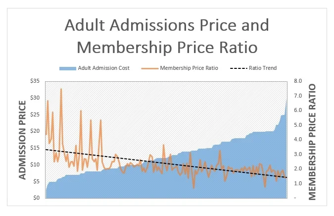 Short answer: it depends. There are a lot of variables in play besides the cost of admission. But when we look at how your peer organizations are pricing theirs, there is good data that points towards correlating your admission fees to a membership price ratio that is at or near that trend.