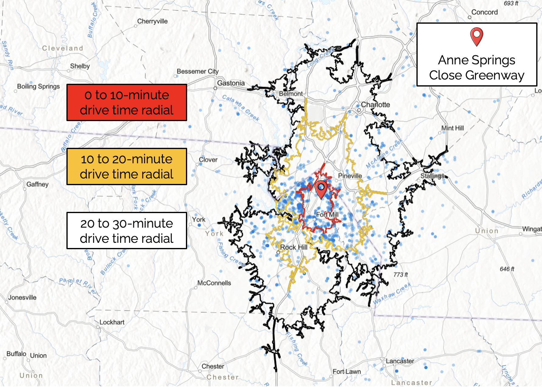 Anne Springs Close Greenway: Map of drive-time radials. Red = 0-10 mins. Yellow = 10-20 mins. Black = 20-30 mins.