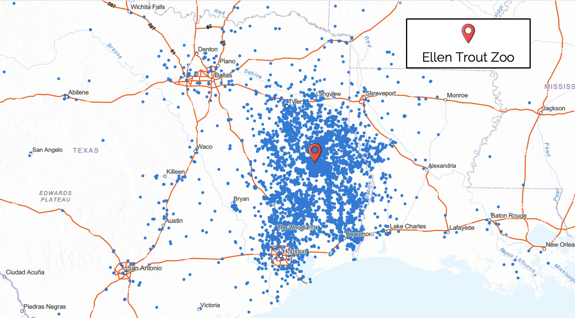 Ellen Trout Zoo: U.S. highway map. The blue dots represent visitor origins and the orange lines show the freeway system.